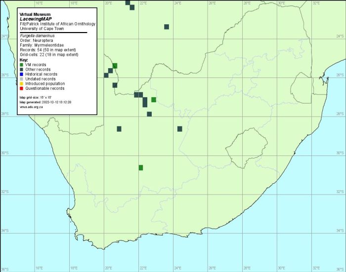 The use of photographs by Aletta Liebenberg, Evert Kleynhans, Jacobus Labuschagne and Stephen Ball is acknowledged. This species text has benefited enormously from comments made by Mervyn Mansell on records he has identified in LacewingMAP. We acknowledge his important contribution.