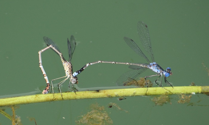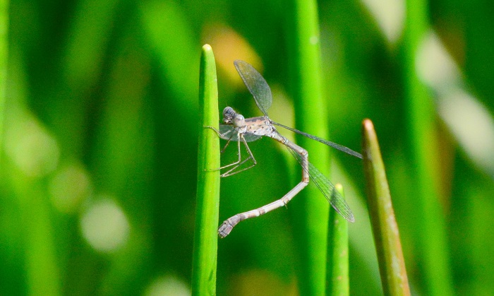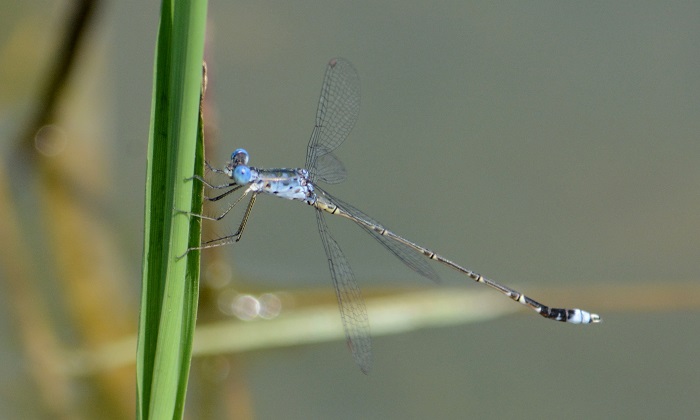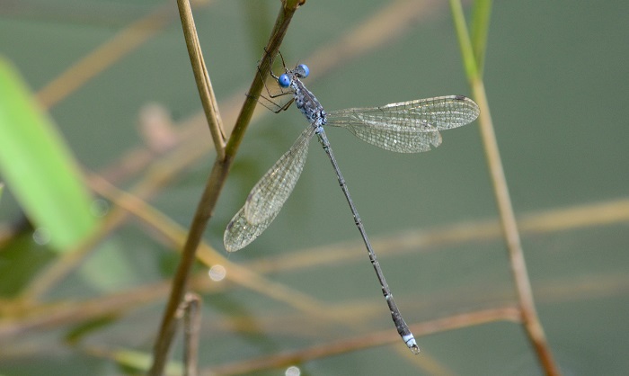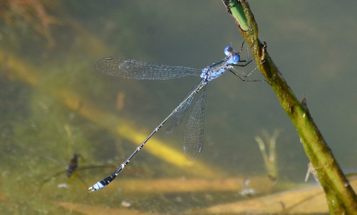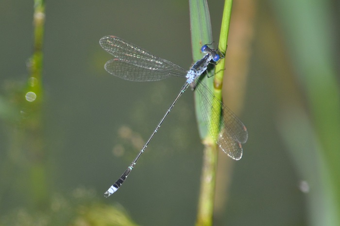 During the hottest and coolest times of the day, Spotted Spreadwings are mostly inactive and spend long periods hanging vertically from emergent grass stems. At mid-morning, the males are often very active as they chase each other from stem to stem. The females are frequently seen with the males. Spotted Spreadwings are easily overlooked. Their blue-grey colouration and slender bodies blend perfectly with the grass and glare from the water.