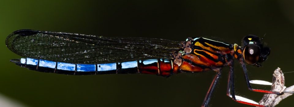 Cover photo by Gert Bensch. Find the Dancing Jewel in the FBIS database (Freshwater Biodiversity Information System) here. Family Chlorocyphidae Identification Small size Length attains 34mm; Wingspan reaches 52mm. Adult Males are brightly coloured and easily recognised. Females and immature males are very difficult to separate from Platycypha fitzsimonsi females. Females are best identified when … Continue reading Dancing Jewel (Platycypha caligata)