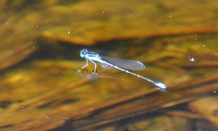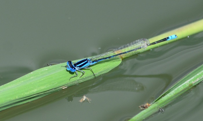 The Sailing Bluet is mostly found low down close to the water, where it perches on lily pads or emergent plants. The flight is fast and typically low over the water. When the weather is calm, the Sailing Bluet sometimes alights gently on the water without breaking the surface. They then drift across the pond in the breeze with their folded wings acting as sails (see image below). Females are often found in the same vicinity as the males.