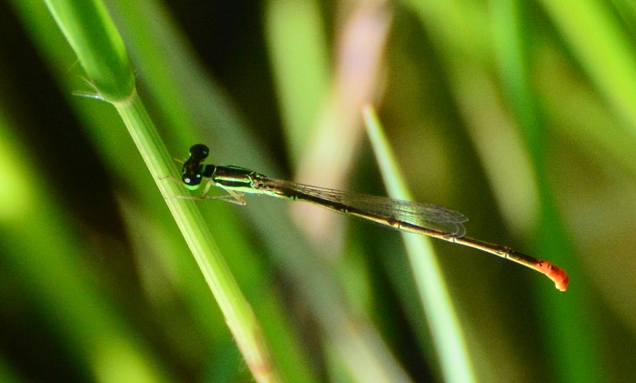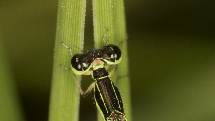 The Little Wisp is most like Agriocnemis pinheyi (Pinhey’s Wisp). They are similar in size and are, in fact the two smallest damselflies in the region. Pinhey’s Wisp has an unbroken green line across the face and an incomplete green line across the prothorax. The Little Wisp shows the exact opposite, having a broken green moustache and an unbroken green line on the prothorax.