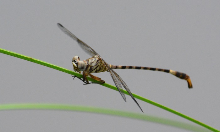 The Spined Fairytail has the typical colouration of many gomphid species. It is best recognised by its small size, and very distinctive downward pointing abdomen.