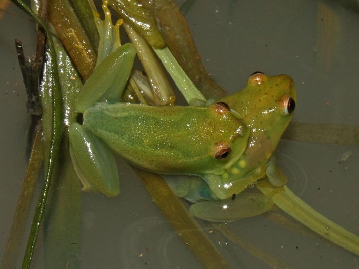 Choruses are characterised by high levels of aggressive behaviour between males, especially in the early evening when calling is at its peak. At such times, a minimum distance of 25 cm is maintained between calling males by means of the advertisement call, an encounter call, and physical contact between calling males (Cleminson 1991). During territorial disputes, males often butt one another with their vocal sacs (Passmore and Carruthers 1995).