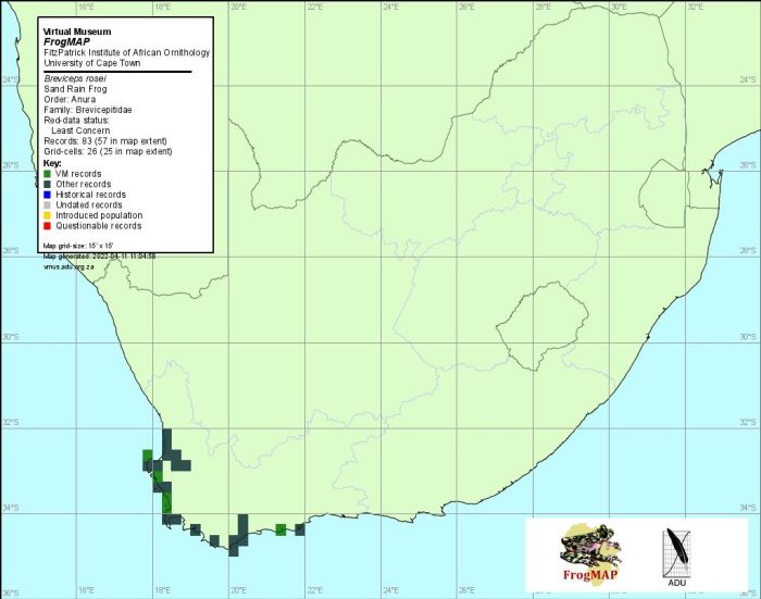 Given the species’ narrow distribution range, it is clear that its populations are vulnerable to fragmentation and local extinction. In view of the current lack of clarity regarding the status of B. r. rosei and B. r. vansoni, they should be considered separately in assessments of conservation needs. Adequate protection could be afforded by a series of coastal reserves. In the west, the Sand Rain Frog is known from the West Coast and Cape Peninsula national parks and the Rocher Pan Nature Reserve, and in the south from the De Hoop and De Mond nature reserves, and Bontebok National Park.