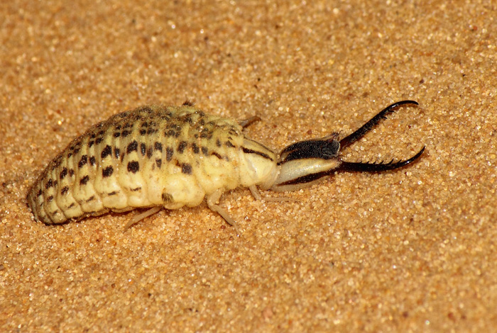 The very large larvae are voracious predators, which inhabit deep sand. They come to the surface at night to lie in wait for prey and leave characteristic tracks in the sand where they surface. They ambush their prey and do not construct pit-fall traps. The white body is thought to be an adaptation to reflect heat in the arid, hot environments in which they live.