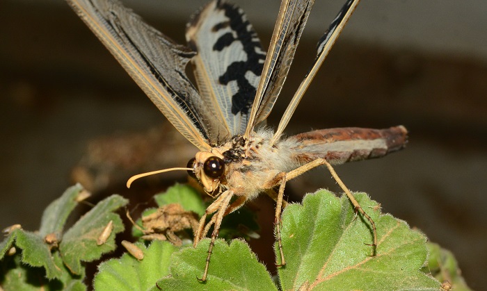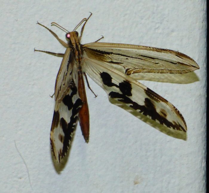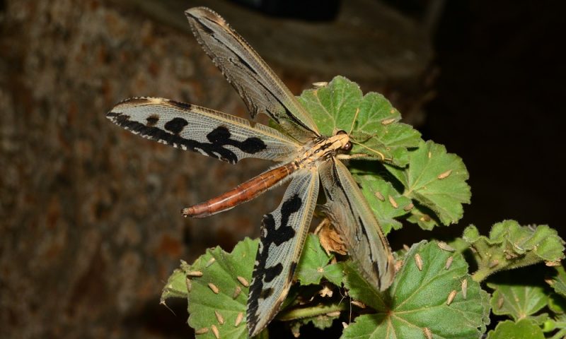 Golafrus oneili is one of southern Africa’s most magnificent antlions. The adults have long, narrow wings. The posterior margin of each wing is incised, forming a raised ridge when folded at rest. The wings provide effective camouflage when inactive during the day. G. oneili has extremely long legs relative to other Palparinae.
