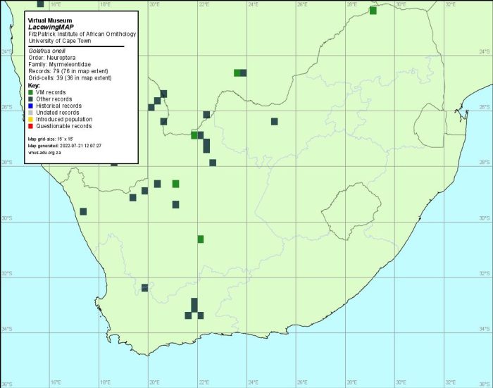 Distribution of Golafrus oneili. Taken from the LacewingMAP database, July 2022.