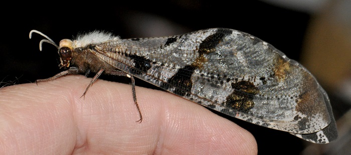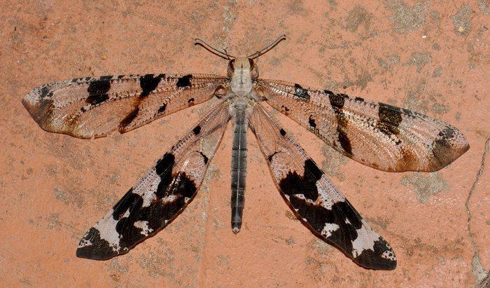 Lachlathetes moestus is one of southern Africa’s most spectacular antlions. The adults have long, broad-tipped wings. The thorax is grey and very hairy, paler above than along the sides. The abdomen is dark grey. The legs are a dull to bright reddish-pink colouration. It is one of the largest species of antlions known anywhere in the world.