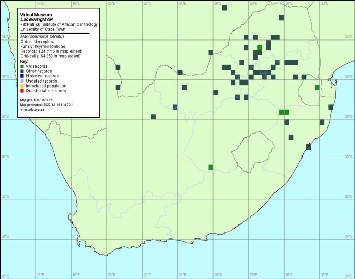 The use of photographs by Alan Manson, Cornelia Rautenbach, Kate Braun and Vaughan Jessnitz is acknowledged. This species text has benefited enormously from comments made by Mervyn Mansell on records he has identified in LacewingMAP. We acknowledge his important contribution.