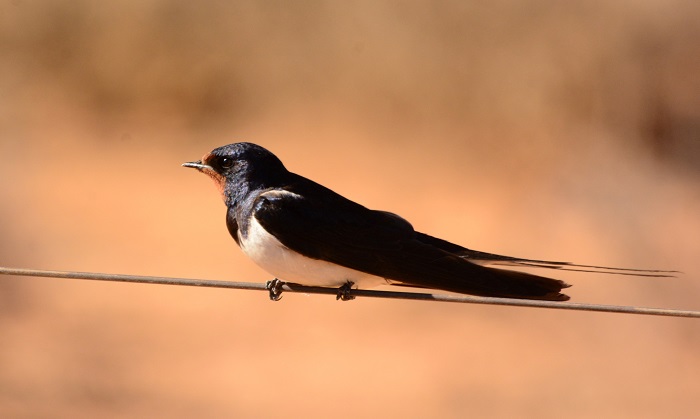 The Barn Swallow is medium-sized in comparison to other swallows. In adults, the upperparts are dark glossy blue. The forehead, chin and throat are rufous coloured, and the lores are black. The throat is bordered below by a blue-black band. In some races, the rufous throat extends into the collar, sometimes even replacing it.