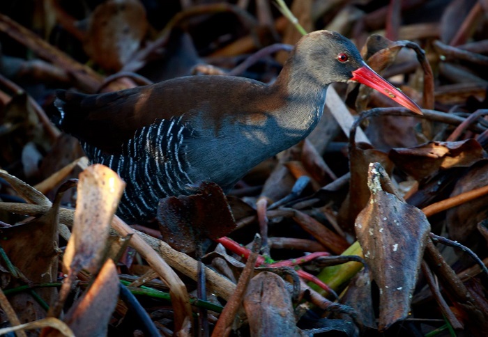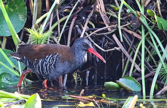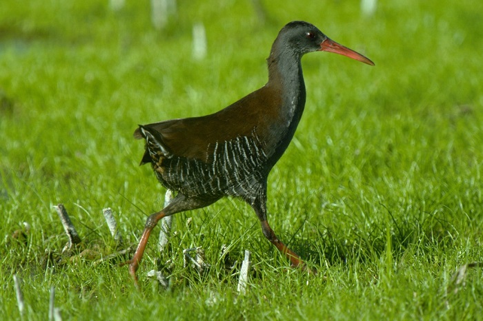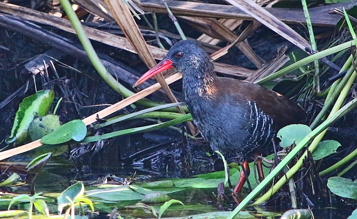 Rails belong to the Family: RALLIDAE. This family also includes Crakes, Swamphens, Flufftails, Gallinules, Moorhens and Coots etc. Their physiology is diverse, but most have laterally compressed bodies, short tails, short rounded wings and well developed legs and feet. The bill structure is variable. Most birds in this family inhabit wetlands or forest undergrowth and are usually vocal and highly secretive.