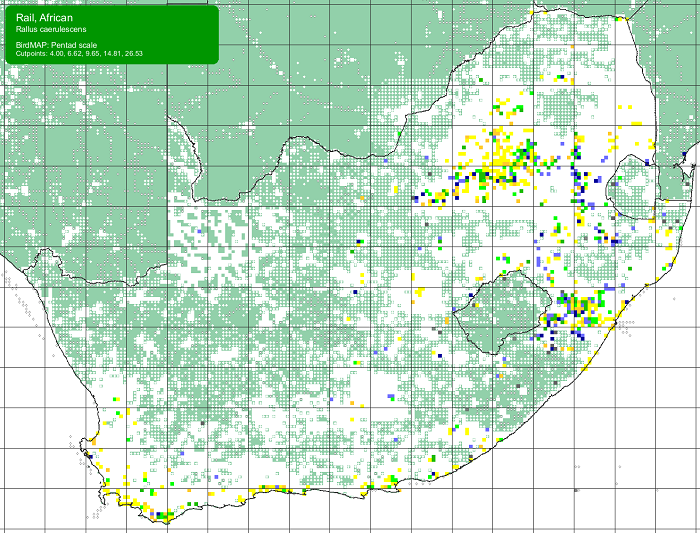 The African Rail is largely absent from the driest regions of southern Africa, including the Kalahari and Namibia, but with scattered records from the central and north-eastern Karoo. It is locally distributed elsewhere, mainly in the north and east, extending along the littoral to the Western Cape.