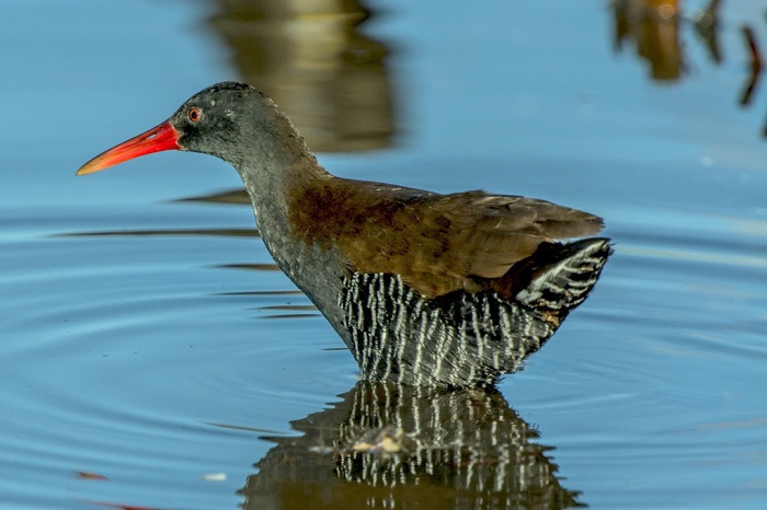 Within the cover of reedbeds, the African Rail’s movements are jerky, often while raising and flicking its tail. They walk more purposefully in the open, taking quick, long strides. When alarmed, the African Rail stands upright, flattens its plumage, and raises its tail. If a potential predator approaches, they will stand motionless before crouching flat until the threat has passed. The African Rail flies low with dangling legs, and they can also swim competently when needed. They climb well, too, sometimes clambering to the tops of tall reeds.