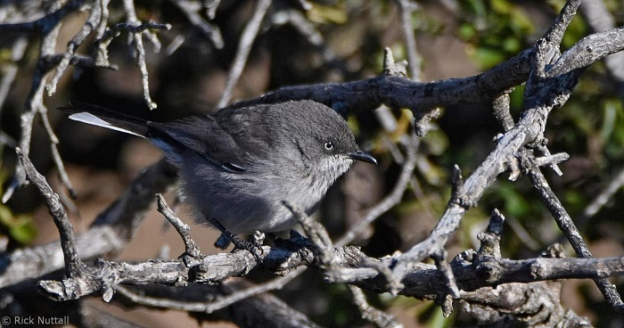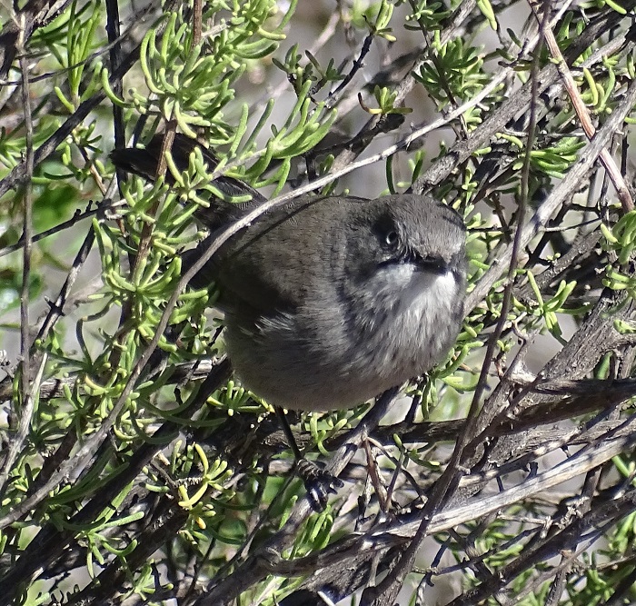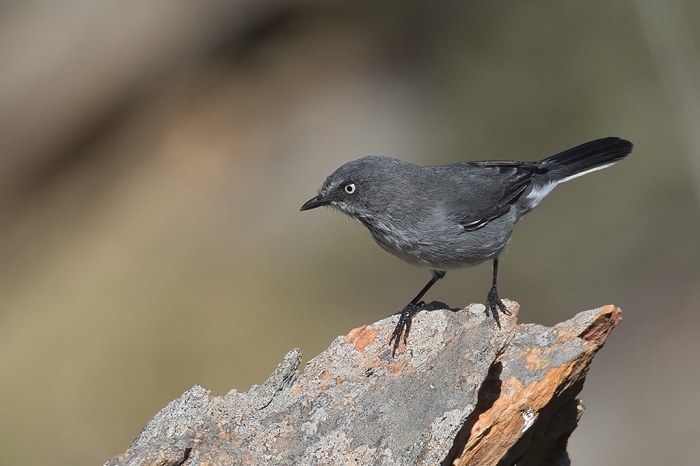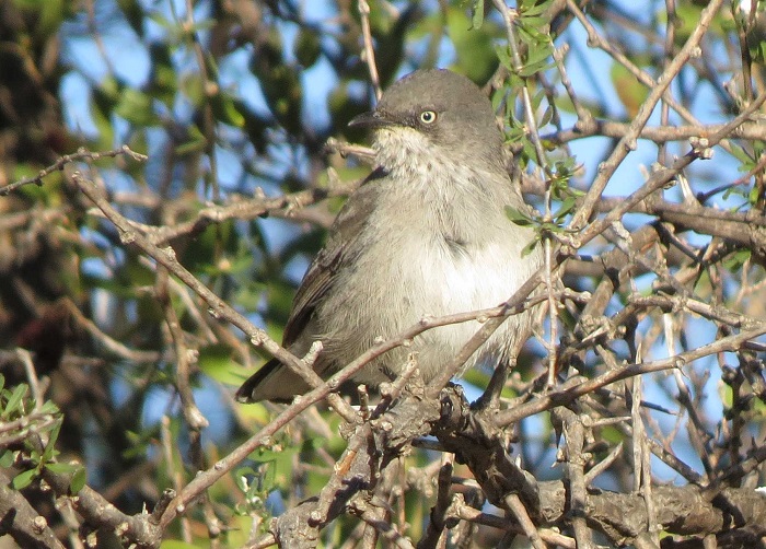 In the Layard’s Warbler, the sexes differ slightly in plumage coloration, but this is difficult to see in the field. The adult male is predominantly slate grey in overall appearance. The upper parts are slightly darker than the undersides. The chin, throat, and upper breast are off-white, and the throat carries fine, black streaks. The lower breast is pale grey, palest in the middle, and the flanks are washed darker grey. The Undertail Coverts are white (diagnostic). The tail itself is black, edged, and tipped white. The eye is white (diagnostic in both sexes), and the bill, legs, and feet are black.