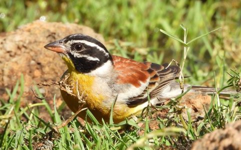Cover image of Golden-breasted Bunting by Ansie Dee Reis – Dikhololo Resort, North West Buntings belong to the Family: EMBERIZIDAE. The bunt...