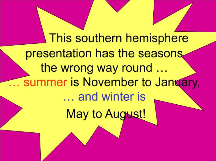 Adopting gnirps, remmus, llaf and retwin for the seasons in the southern hemisphere would save a lot of boreals in scientfic papers. It would also prevent a lot of confusion during conferences presentations, when southern hemispherists totally lose their northern hemisphere audiences. We talk about summer, and we are thinking “December-January-February” and our audience is thinking “June-July-August”. We need to include a slide like this: